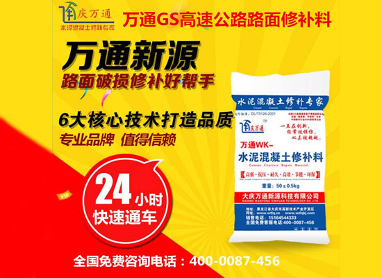 大慶萬通新源科技有限公司獨有的混凝土路面高強速補料,是水泥混凝土路面病害修復(fù)的好材料。疲勞、凍融循環(huán)、彎曲壓力、滲水和基層破壞等原因都會引起水泥路面的破損,從而帶來高昂的維護費用。與以往的剛性修補方法不同,混凝土水泥路面維修速補膠提供了一種獨特的柔性修補產(chǎn)品和技術(shù),高柔性、高抗拉性,可跨伸縮縫施工和高抗壓性使得混凝土快補產(chǎn)品為水泥混凝土路面提供了******性的修補。傳統(tǒng)的剛性修補方案,如環(huán)氧砂漿和快干水泥產(chǎn)品,由于其自身的粘結(jié)失效,抗疲勞性低以及與原路面不同的伸縮系數(shù),修補面會在短時間內(nèi)失效或產(chǎn)生新的裂縫,需要反復(fù)修補,有效期短且費用高昂。大慶萬通新源科技有限公司的混凝土水泥路面維修速補膠可以隨原路面一起伸縮,移動,從而避免了粘結(jié)失效和產(chǎn)生新裂縫。萬通快補產(chǎn)品優(yōu)異的粘結(jié)性、柔韌性和高防滑性,特別適用于水泥路面的淺層粘合修補,多邊角混凝土板層修補,跨伸縮縫修補以及路面沉陷修補。萬通混凝土病害修補料針對混凝土起皮起沙、斷板裂縫、蜂窩麻面、坑槽露石子、漏筋掉皮、橋梁的掉皮漏筋快速通車使用時間長。應(yīng)用萬通快補產(chǎn)品,施工后一天就可以恢復(fù)交通。大慶萬通新源科技有限公司的萬通水泥路面維修速補膠適用于高速公路、機場路面、農(nóng)村村村通路面、廠坪、學(xué)校操場、市區(qū)公路、小區(qū)路面、橋梁、水泥路面的修補。使用萬通特快補材料修補路面可以一勞永逸! 水泥地面起砂怎么辦,混凝土修補劑混凝土地面起砂,混凝土地面修補,地面起砂怎么辦,